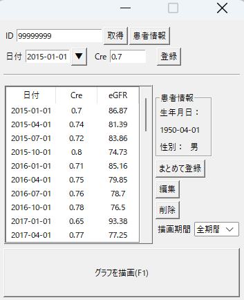 eGFRの推移をグラフ化するツールです。患者のクレアチニン値と検査日を入力するだけで、自動的にeGFRを計算し、その推移をわかりやすいグラフで表示します。